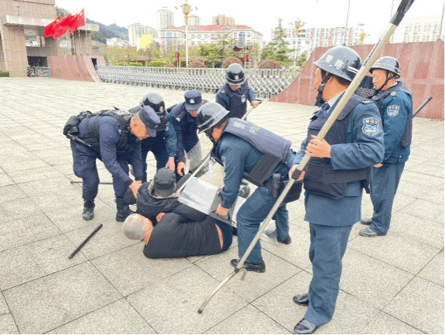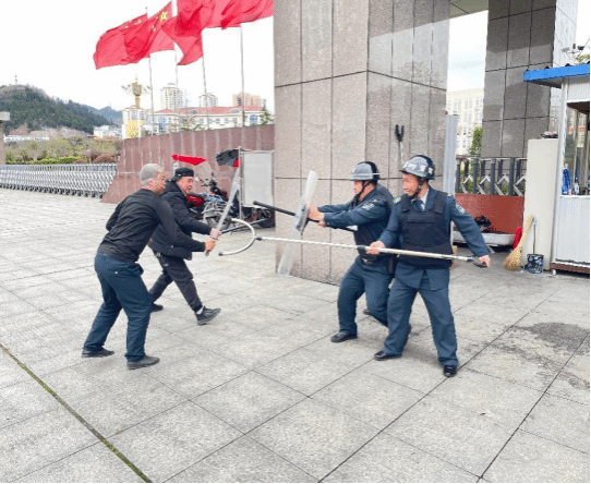 演练开始,一辆可疑面包车欲冲撞学校大门,随即2名男子下车欲持械强行闯入学校门口,保安人员立即手持防爆器材齐心协力将其围住并试图抓住“歹徒”,他们使出了浑身解数与歹徒搏斗,争分夺秒的奋力周旋下,“歹徒”最终被制服。