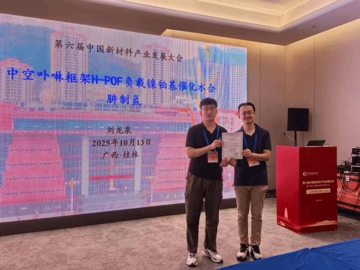 会上,我院2024级硕士研究生刘龙泉在储氢材料分会场作题为“中空卟啉框架负载镍铂基催化水合肼制氢”的学术报告,系统展示了课题组在储氢材料催化剂设计与制备、新型储氢材料研发以及储运氢系统应用探索等方面的阶段性研究成果,内容详实、逻辑严谨,获得与会专家的关注与积极评价。