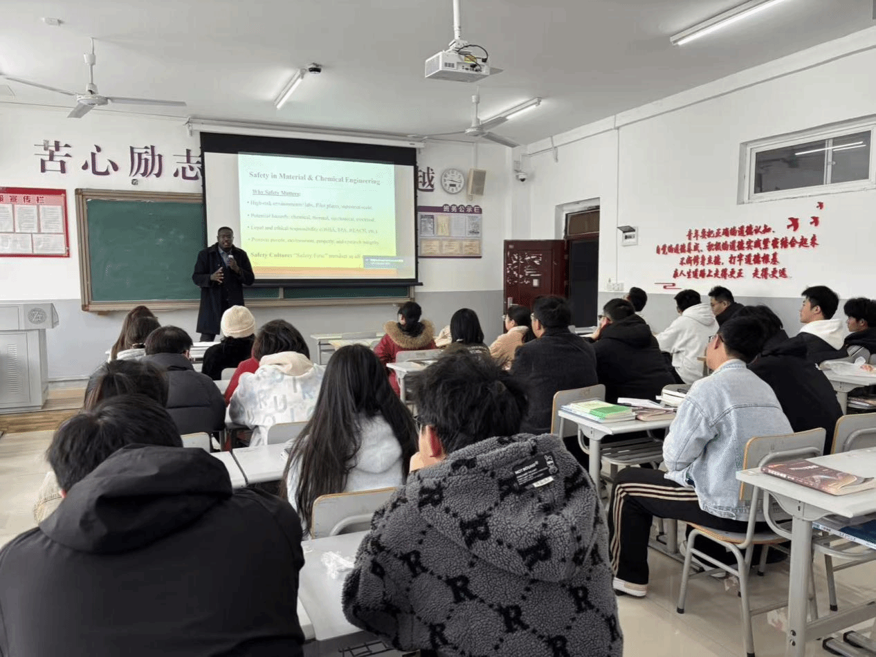 2025年12月3日,我院外籍博士 Amir Mahmoud Makin Adam 在依仁楼 B402 教室为2025级材料与化工专业研究生讲授《材料与化工安全工程》课程。课堂内容紧扣“材料与化工安全”主题,围绕化学安全、物理安全、自然安全及人为因素等维度,系统讲解实验室常见风险识别、防范要点与应急处置措施。授课中,Amir 博士以“为什么安全至关重要”为切入点,梳理高危实验环境类型及潜在安全隐患,并结合美国职业安全与健康管理局、国际标准化组织等相关国际安全标准,强调“安全第一”的国际通用理念应贯穿实验操作全过程。随后,他聚焦个人防护装备展开重点讲解,从眼部、身体、手部与面部防护等方面明确使用规范与注意事项,提醒同学们个人防护是实验安全的重要屏障与关键防线。