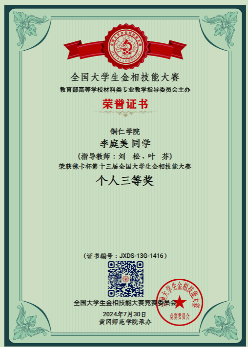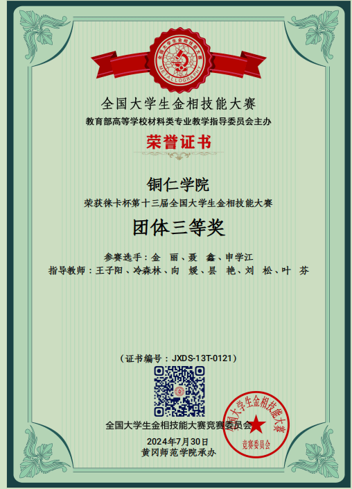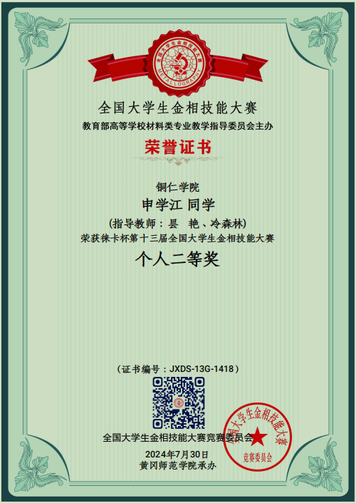 7月25日-30日,由教育部高等学校材料类专业教学指导委员会主办、湖北黄冈师范学院承办的第十三届全国大学生金相技能大赛决赛在湖北黄冈举行。本次大赛分预赛和决赛两个阶段,预赛报名参赛高校达571所,参赛选手达400488名。经过26个分赛区预赛选拔,最后531所高校1460名选手参加决赛。大赛规模空前,有参赛高校选手、指导教师、竞赛委官员、裁判、特邀嘉宾共计3520人齐聚湖北黄冈共襄盛会。beat365王子阳、向媛、昙艳3位指导教师代表beat365英国官方网站带领我院材料科学与工程专业的2021级、2022级金丽、聂鑫和申学江同学参加本次国赛决赛。参赛选手秉持“执着专注、精益求精、一丝不苟、追求卓越”的工匠精神,沉着应战,激烈比拼。beat365参赛选手在赛场上充分发挥自己的能力,取得了优异成绩,其中,金丽同学获个人“一等奖”,聂鑫和申学江同学分别获个人“二等奖”,beat365英国官方网站代表队获团体“三等奖”的好成绩。
