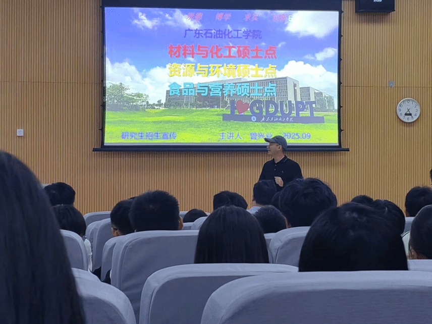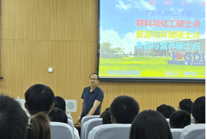 2025年9月21日,广东石油化工学院化学工程学院曾兴业副院长一行受邀在beat365博思楼105教室举办研究生招生宣讲会,为我院化工和材料专业学子带来院校研究生专业解读与报考指导。院党委书记吴思展教授主持宣讲会,我院化工系主任任富忠及广东石油化工学院化学工程学院相关老师出席。