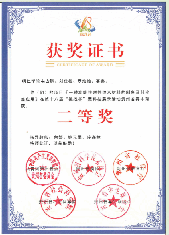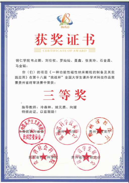 2023年11月,材料科学与工程专业学生在第十八届“挑战杯”全国大学生课外学术科技作品竞赛贵州省赛决赛中荣获“三等奖”;在第十八届“挑战杯”黑科技展示活动贵州省赛中荣获“二等奖”。