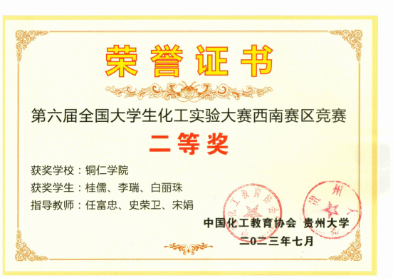 为了贯彻落实全国教育大会精神,推动高等学校化工类专业“新工科”建设,提高本科化工类专业核心课程教学质量,加强大学生综合素质与能力培养,提升教育服务化工行业发展的水平,中国化工教育协会举办了主题为“启航-化学工程师”的全国大学生化工实验大赛。根据组委会要求beat365英国官方网站组织进行了选拔赛,根据选拔结果派出由2021级化学工程与工艺专业的9名同学参加与2023年7月14日-16日在贵州大学举办的西南区赛,经过激烈竞争,取得了“二等奖”一项,“三等奖”4项的较好成绩。通过本次竞赛有助于提升化学工程与工艺专业的建设质量以及提升本专业学生对于与就业技能密切相关化工单元操作的基本知识的理解深度。