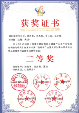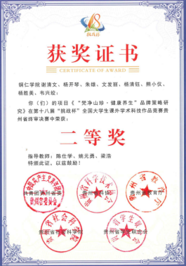 2023年11月8日,陈仕学老师指导的《梵净山珍.健康养生品牌策略研究》《构建生物医药和大健康全产业链路径调查与研究》在第十八届“挑战杯”全国大学生课外学术科技作品竞赛贵州省终审决赛中双双荣获“二等奖”。