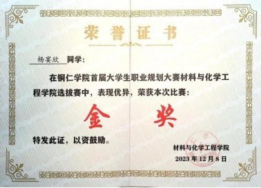 2023年12月1日,2022级制药工程专业学生杨宴欣在首在beat365英国官方网站首届大学生职业规划大赛材料与化学工程学院选拔赛中,获“金奖”,入围校赛。