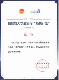 2023年10月,2022级制药工程杨宴欣同学在2023年福建省大学生实习“扬帆计划”中表现突出,评为福建省校园引才青年志愿者。