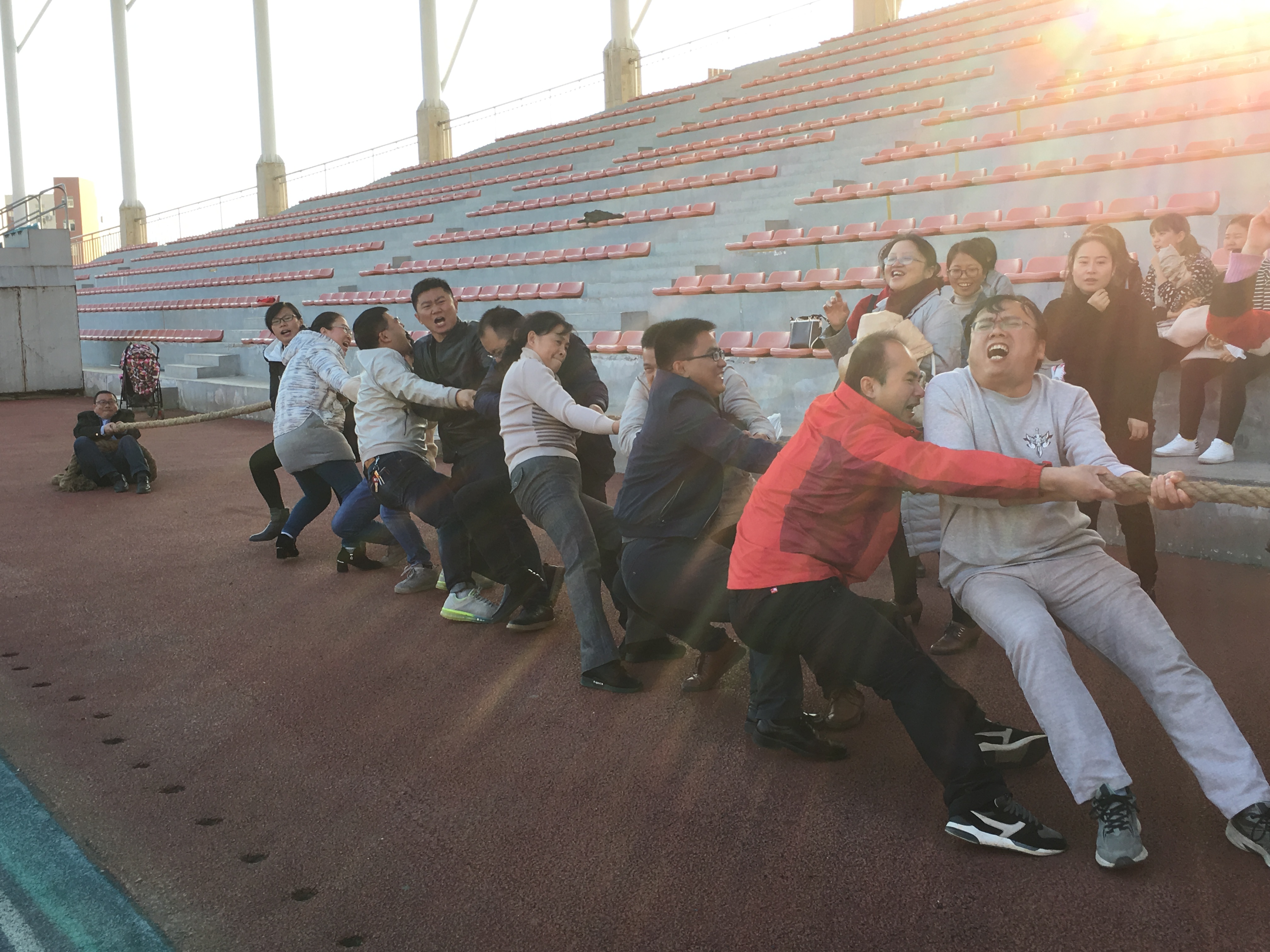 比赛准备阶段,双方选手们紧急安排自己的比赛策略,甚至有老师可爱的把绳子紧紧的绑在腰间;裁判员一声令一下,比赛刚开始,选手们鼓足了劲,咬紧牙,“123”一起向后拉紧大麻绳,各个面红耳赤,尖叫声、欢呼声、呐喊声统统融为一体,各个系的拉拉队为自己的系加油、呐喊。在强烈的竞争态势下,各队根据第一轮比赛取得的经验和教训,调整战略,发扬优势,取长补短。为了共同的目标,他们都向同一个方向倾倒,团结一致,为同样的荣誉奋斗、努力,老师们的心紧紧的联系在一起,当然也不会因为失败了而忧伤,同样在这个过程中收获了快乐。经过精彩热烈的战斗,最终化学工程系获得第一名,食品药品工程系获得第二名,材料工程系获得第三名。