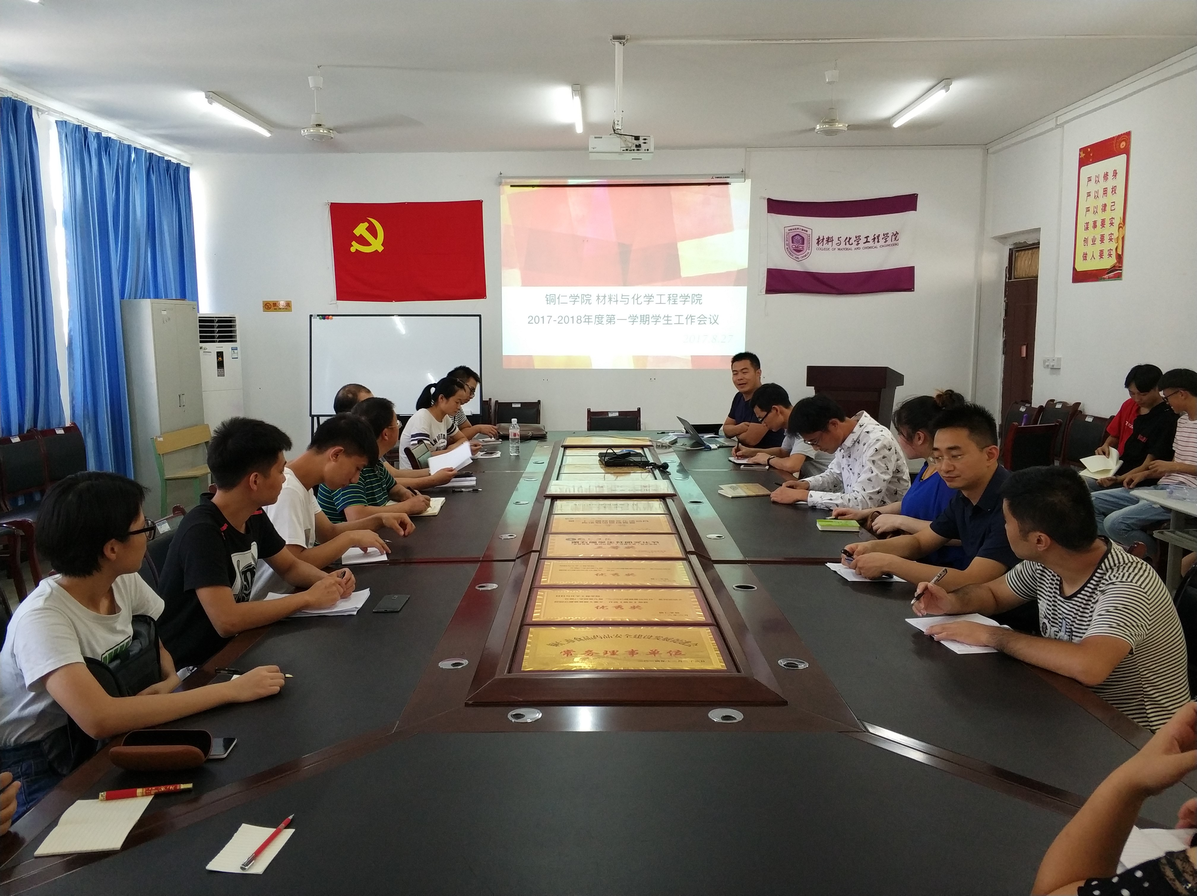8月27日下午16:00,材化院为了使新学期的工作有序并合理的进行下去,在材化院三楼会议室召开“2017-2018学年度第一学期工作会议”会议由院长石维、唐帮成书记、学生科科长邢明明,材化院各班班主任以及各班班长共计45人参加会议,会议由邢明明主持。