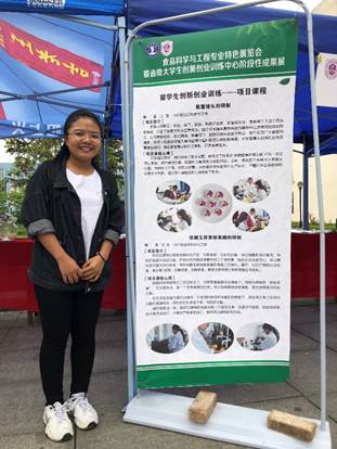 此次展览会对学生创新创业项目课程训练、学生考研、就业等方面进行展示,2017级食品科学与工程专业的4名留学生丁玉良、孔雨娜、凯西、文琦也参与积极其中,并利用所学专业知识制作产品,体现食品科学与工程专业对留学生在创新能力、实践能力等方面的高质量多元化培养。