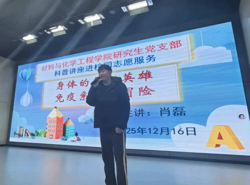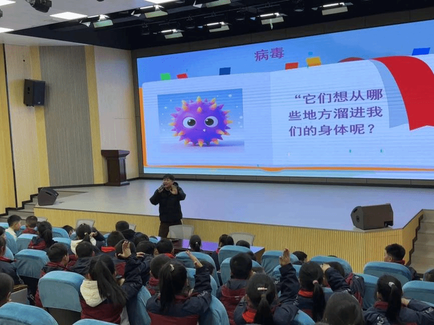 下午1:30,活动正式拉开帷幕。在报告厅,三年级的小朋友们跟随研究生党支部肖磊同志的讲解,开启了一场“人体免疫系统大冒险”。肖磊同志将复杂的免疫系统比喻为身体内的“超级英雄联盟”,生动介绍了巨噬细胞、T细胞、B细胞等如何像巡逻兵、指挥官和导弹工厂一样协同作战,抵御病毒入侵,最后强调了勤洗手、接种疫苗等好习惯的重要性。孩子们听得津津有味,对“身体里的英雄”充满了好奇与赞叹,在互动环节踊跃发言,争相分享自己对抗病毒的“小秘诀”。
