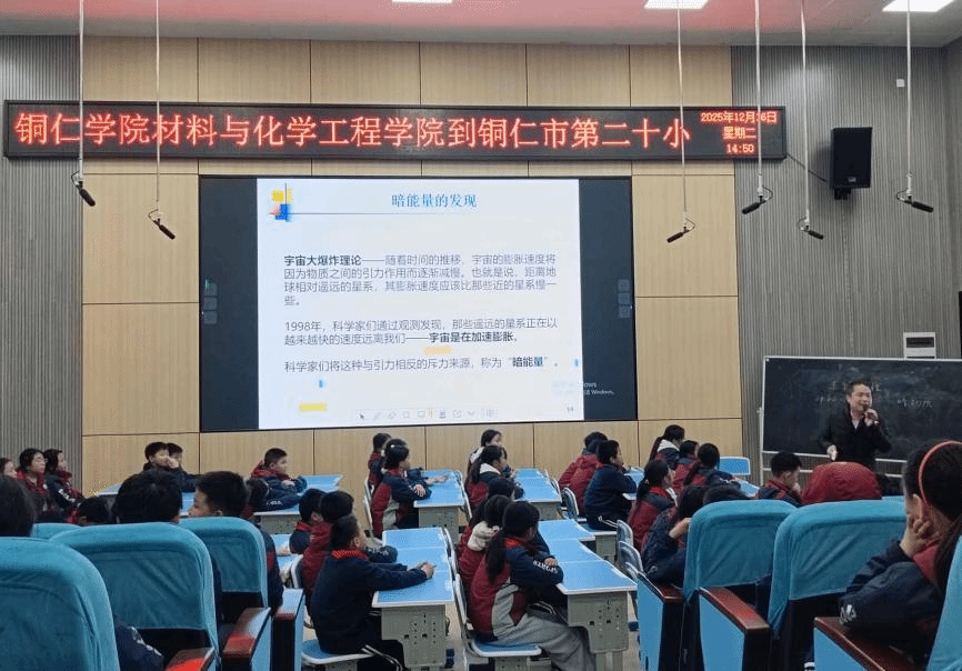 与此同时,在录播室,六年级的同学们则跟随研究生党支部书记李青彪同志进行了一场深邃的《探索宇宙暗物质的奥秘》之旅。从看得见摸得着的物质,到神秘莫测的暗物质与暗能量,李青彪同志用生动的比喻和形象具体的天文发现故事,展现了宇宙的浩瀚与人类对世界认识的局限性。同学们被星系旋转、宇宙加速膨胀等奇妙现象深深吸引,眼神中充满了对星空的好奇与向往,课后仍围着李青彪同志追问关于宇宙的种种问题。