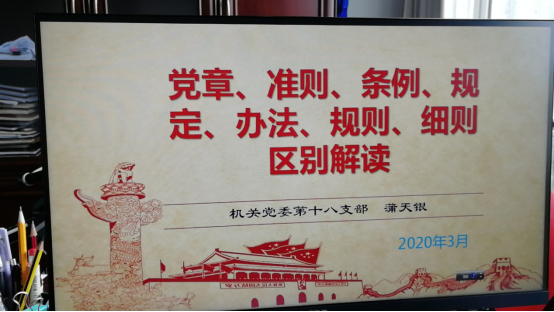 3月27日下午,机关党委第十八支部书记蒲天银同志通过网络形式为全体党员上党课,蒲天银同志就党章、准则、条例、规定、办法、规则、细则区别进行了解读。党的十八大以来,党内法规制度建设取得重大进展和显著成效。先后制定和修订了180多部中央党内法规,出台了一批标志性、关键性、基础性法规制度,党内法规制度体系基本立起来了,总体上实现了有规可依。