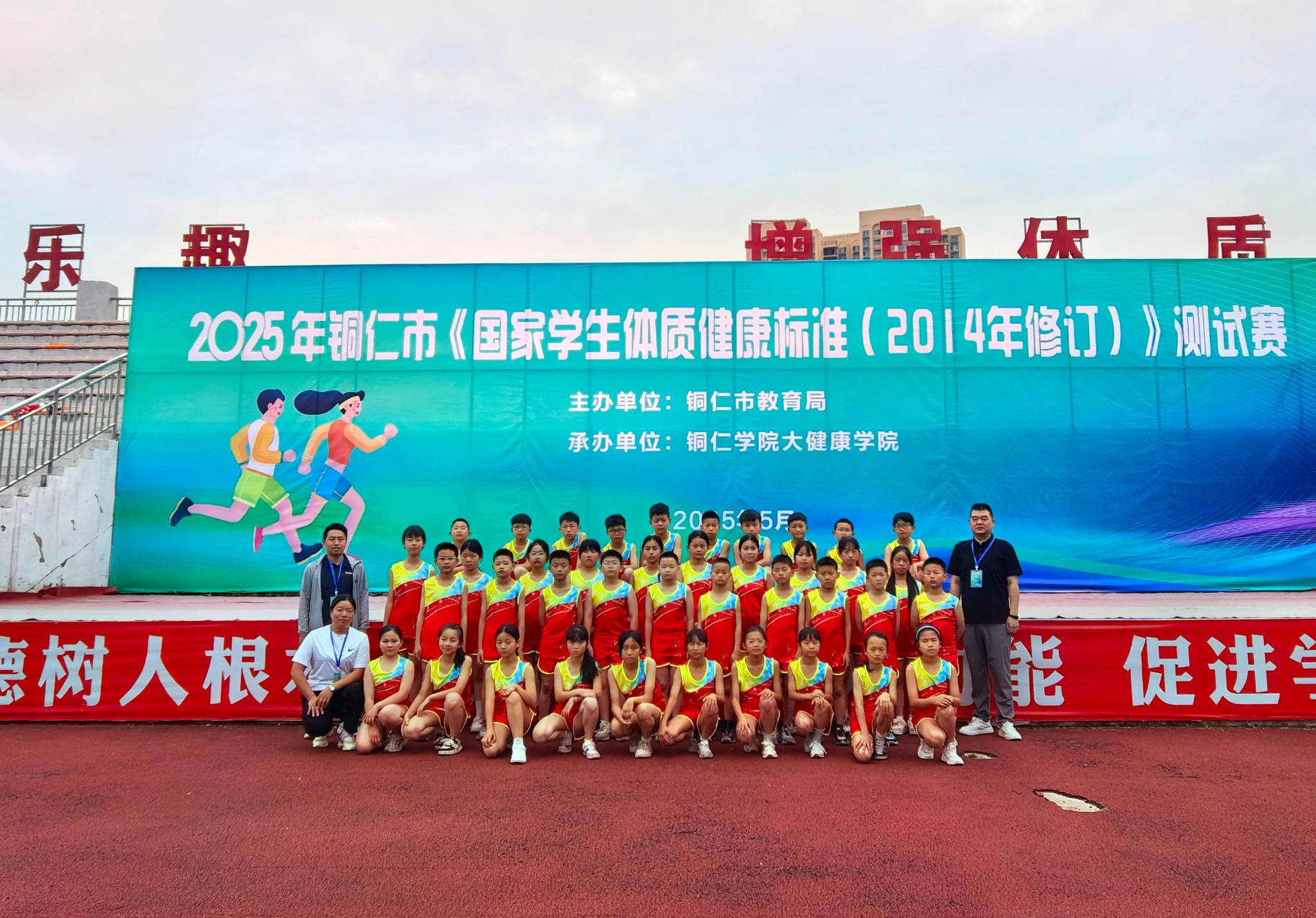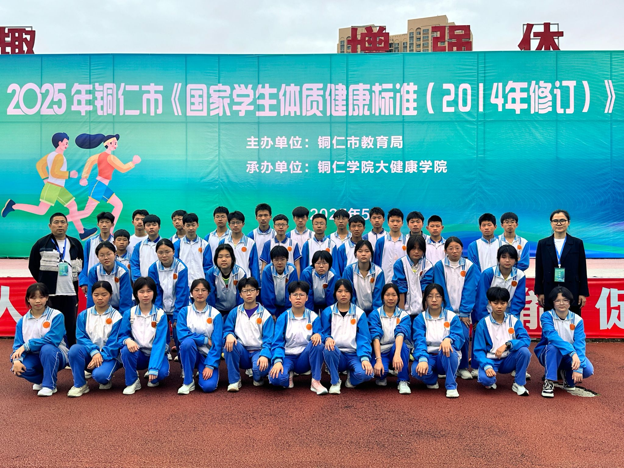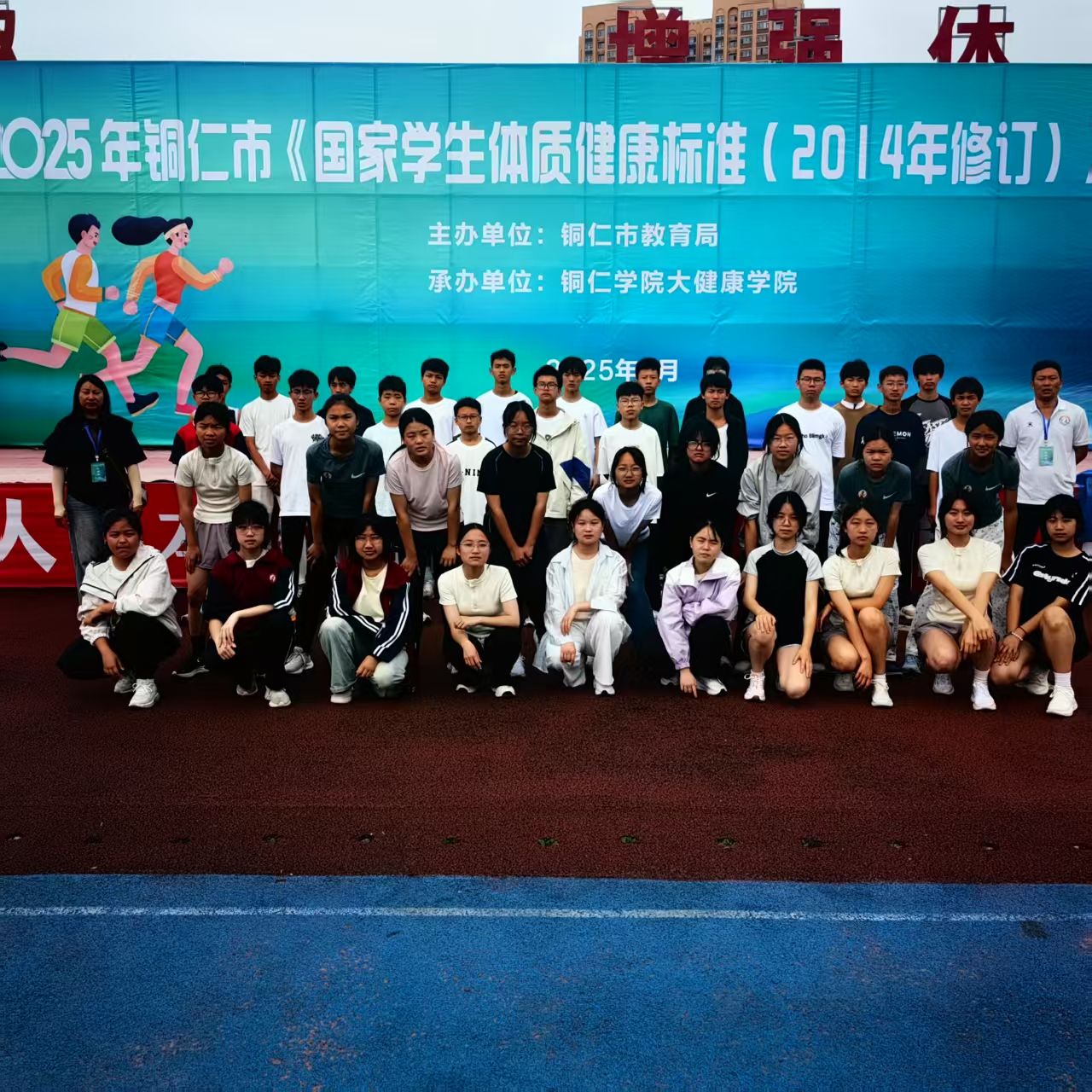 2025年铜市《国家学生体质健康标准( 2014年修订) 》测试赛于5月16-17日在我院举行。测试赛由铜仁市教育局主办、我院承办、全市各区县840名同学参加;参测学生中有一半是统一由铜仁市教育局随机抽取,另一半生由各区县选派组成代表队。本次测试采用全智能仪器设备管理控制系统进行。测试项目包括身体形态(BMI)、身体机能(肺活量)和身体素质(50米跑、坐位体前屈、跳绳、仰卧起坐/引体向上、中长跑等),全面考量学生体质健康各维度。