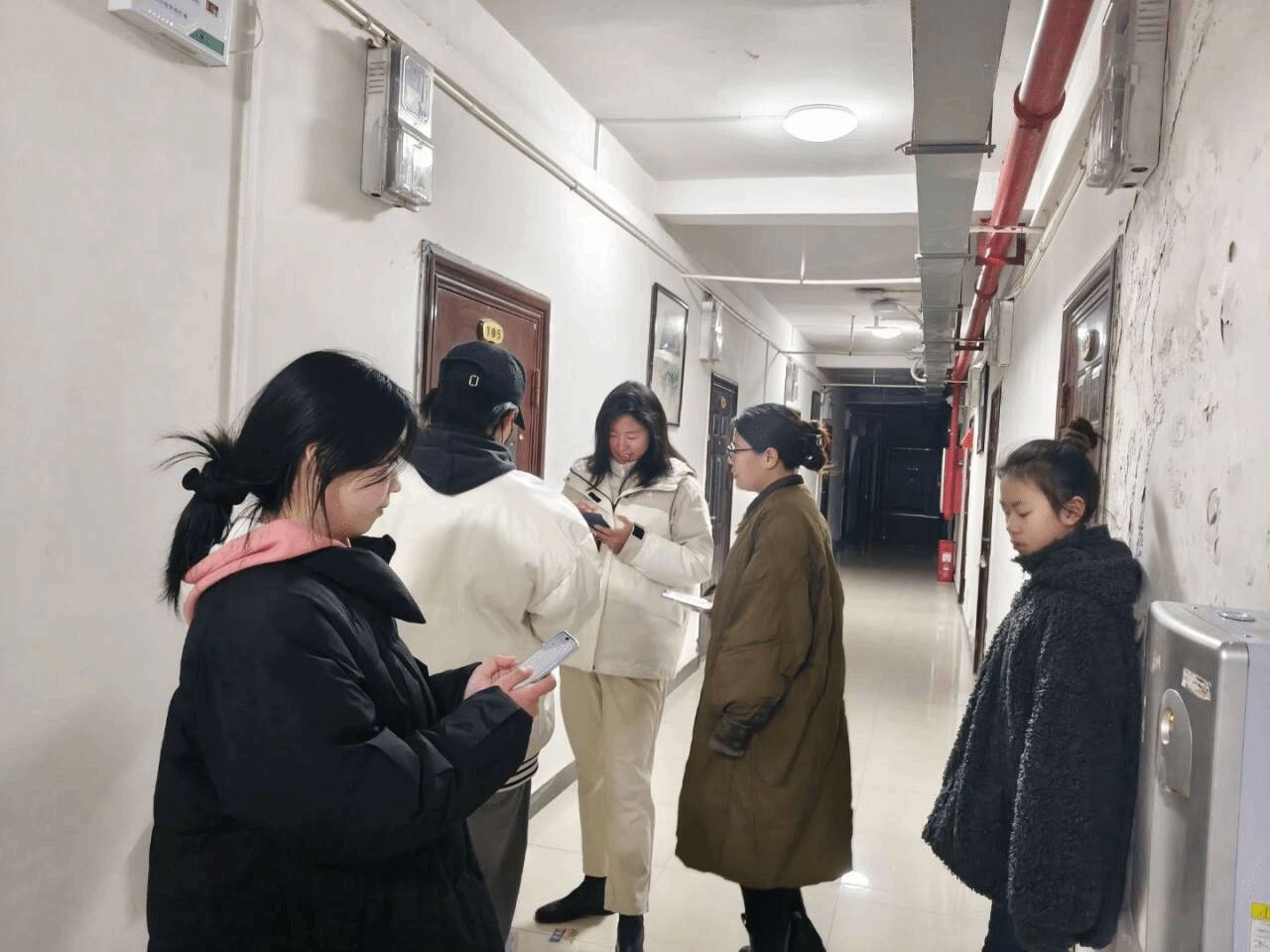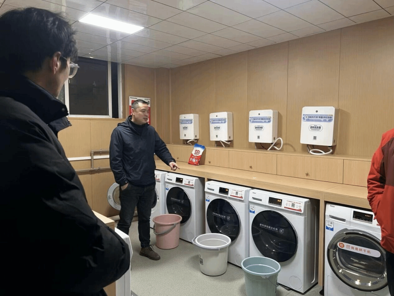 此外,老师们还仔细检查了宿舍楼道、洗衣房及楼梯间等公共区域,查看楼道与楼梯间是否保持整洁,地面有无杂物,通风是否顺畅。检查组强调:洗衣房作为高频使用区,其安全与卫生至关重要,要确保显示设备运行正常,清洁工作到位。