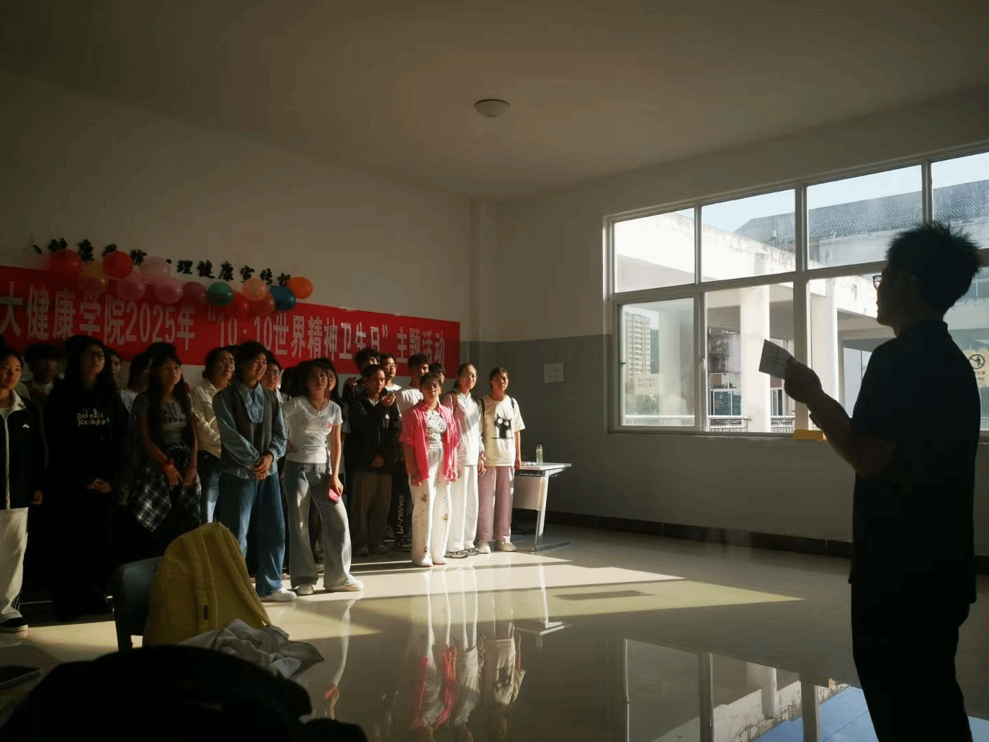 2025年10月17日下午16:20,为丰富校园生活、搭建交流平台,大健康学院在音乐楼成功举办“10·10世界精神卫生日”主题活动。现场氛围热烈,学生参与踊跃。