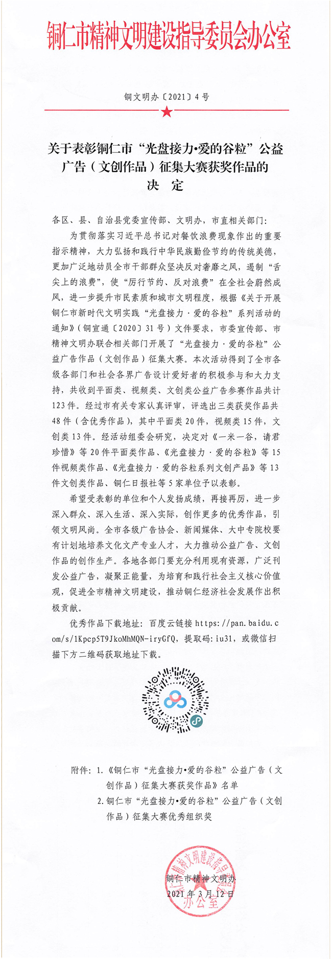 近日,由铜仁市委宣传部主办的“光盘接力·爱的谷粒”公益广告大赛公布获奖名单,共48件作品和5个单位获奖。其中,beat36514件作品在文创类、平面类、视频类均有获奖;beat365还荣获“优秀组织单位”。