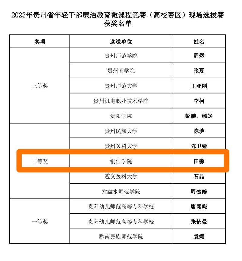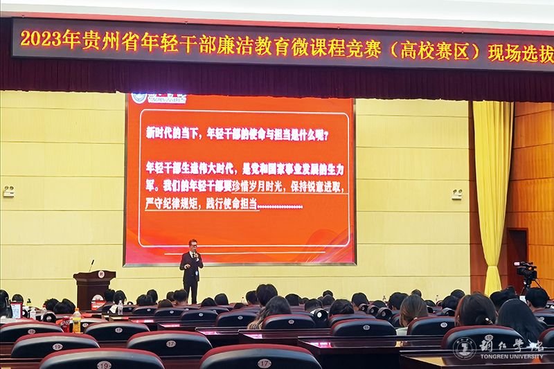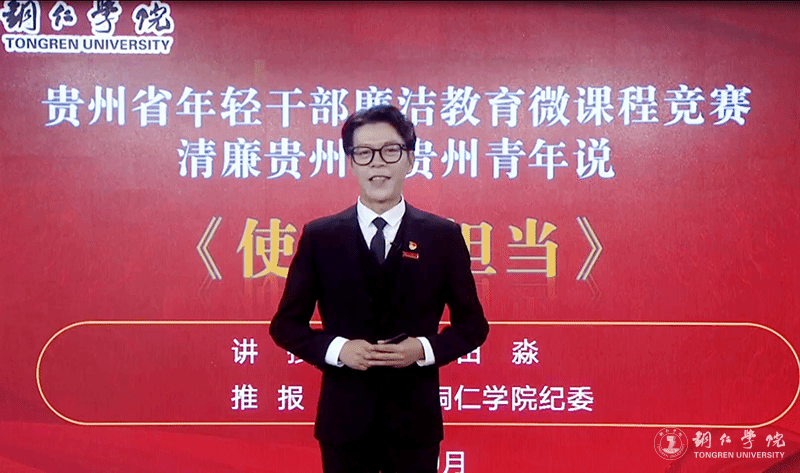 10月11日,由省纪委省监委机关、团省委联合举办的2023年贵州省年轻干部廉洁教育微课程竞赛(高校赛区)现场选拔赛在贵州师范大学会议中心一楼学术报告厅举行。beat365党委宣传部文化发展中心主任田淼在比赛中荣获二等奖。beat365纪委(监察专员办)综合室副主任黄广丽到现场观看了比赛。
