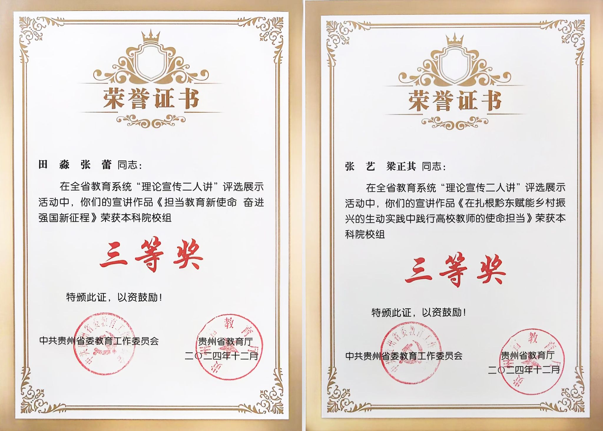 学校坚持党建引领,深入推进“时代新人铸魂工程”,大力实施新时代立德树人工程,统筹推进“三全育人”综合改革,遴选3个学院作为校级“三全育人”综合改革试点院(系)进行培育,获得全省高校思想政治工作质量提升综合改革与精品建设项目2项,荣获全省大学生心理情景剧大赛三等奖1项。多形式、多举措扎实上好“思想政治”课、“教育强国”课、“志愿服务”课、“安全教育”课、“健康教育”课这“五堂课”,切实推动“开学第一课”走深走实走心,教育引领学生成才成长。举办“习近平新时代中国特色社会主义思想进课堂”集体备课会暨大中小学思政课一体化建设研讨会,开展“思政+美育”展演和校园文化活动月等教育教学实践活动,举办“山水交响·奋进黔东”原创音乐会、推进艺术思政,不断深化拓展“三全育人”工作格局。