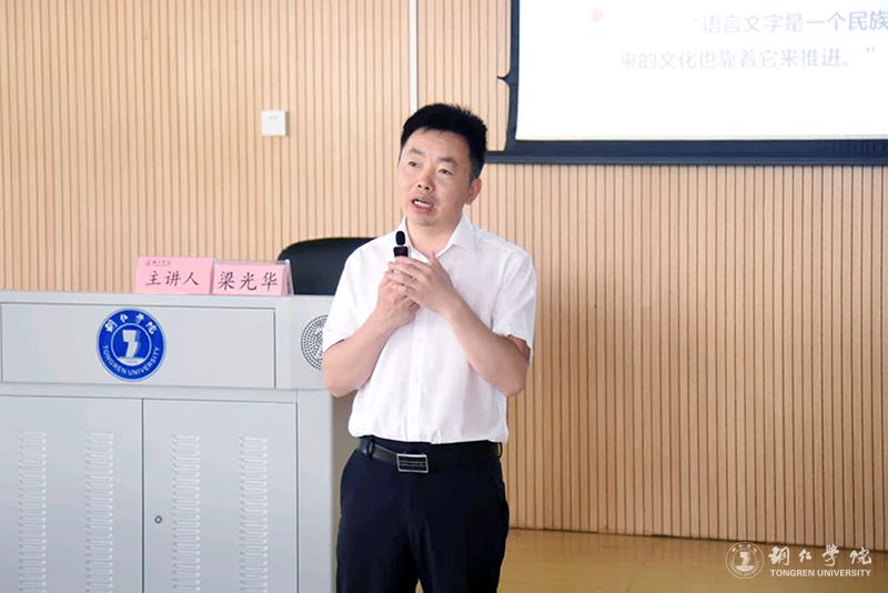 讲座伊始,梁光华以语言学家萨丕尔、罗常培的经典理论为切入点,阐释语言与文化的共生关系。他说,铜仁方言不仅是地域文化的“历史镜像”,更是民族交融的“活化石”,其语音、词汇中蕴藏着丰富的文化信息,全面展现了当地各民族物质与精神文化的多样性。它承载着丰富的历史与民族文化,涵盖风俗礼仪、饮食建筑、音乐舞蹈、体育游戏等多个领域。同时,方言也是生活经验的总结,包含天气谚语、孝道文化等;还揭示了深层次文化心理,不同民族的信仰和文化心理在方言中均有体现。针对铜仁方言传承与发展面临的问题,他提出了四条解决路径:政府主导建立语料库、学校开展方言活动、家庭营造方言氛围、结合非遗保护建立影音资料库。