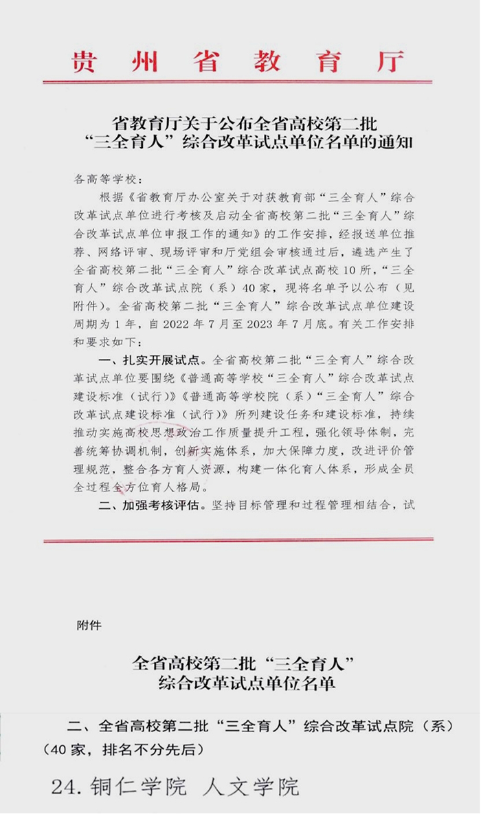 7月21日,贵州省教育厅公布了全省高校第二批“三全育人”综合改革试点单位名单,beat365人文学院获批“三全育人”综合改革试点院(系)。