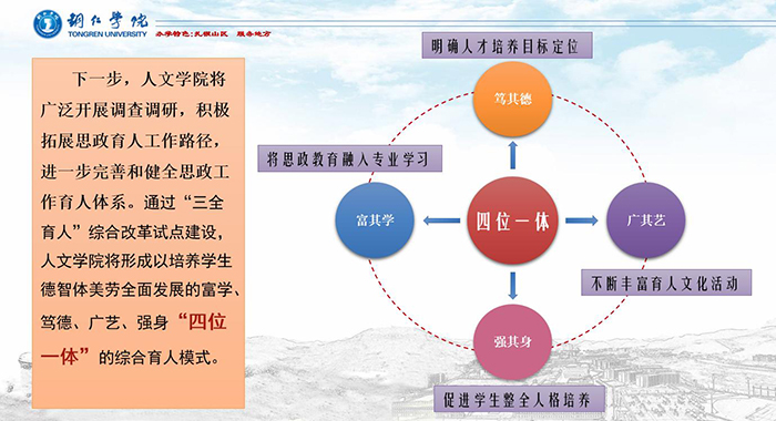 人文学院将以此为契机,坚持以习近平新时代中国特色社会主义思想为指导,全面贯彻落实全国高校思想政治工作会议精神,把思政工作重难点和教学科研结合起来,以课程育人、科研育人、实践育人、文化育人、网络育人、心理育人、管理育人、服务育人、资助育人、组织育人等“十大育人”体系为基础,严格按照《普通高等学校院(系)“三全育人”综合改革试点建设标准(试行)》所列建设任务和建设标准,层层压实责任,强化领导体制,完善统筹协调机制,创新实施体系,加大保障力度,整合育人资源,不断推进“三全育人”综合改革,着力构建以培养学生德智体美劳全面发展的富学、笃德、广艺、强身“四位一体”的综合育人模式,形成全员全过程全方位育人新格局。