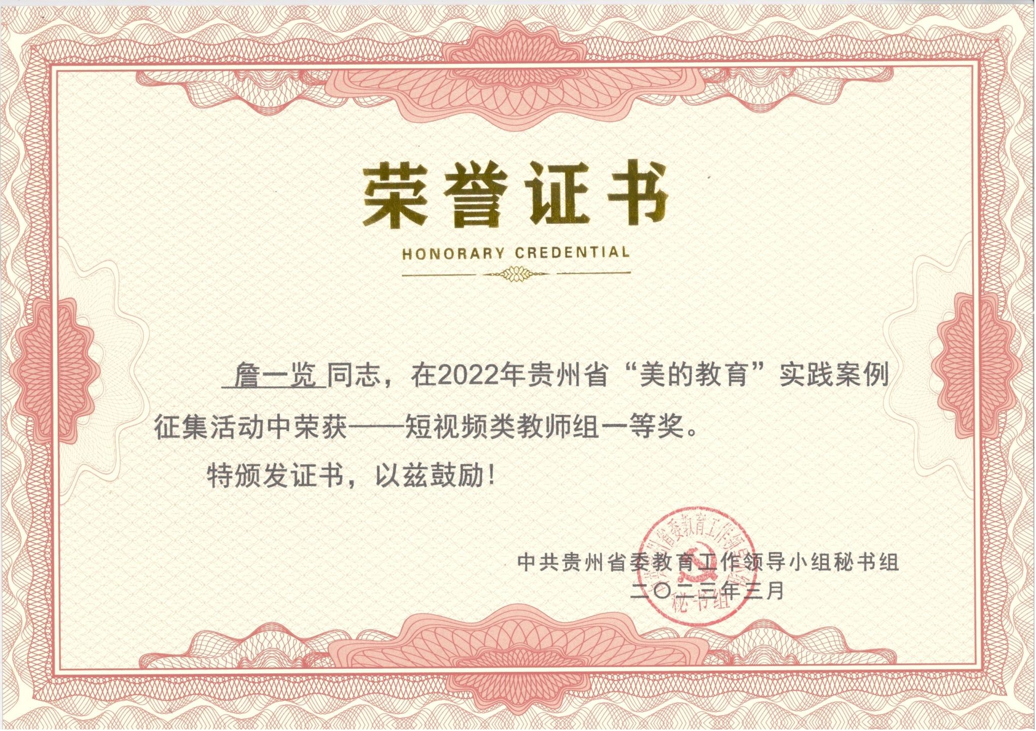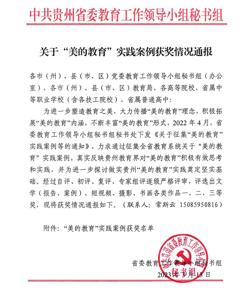 近日,中共贵州省委教育工作领导小组秘书组下发了《关于“美的教育”实践案例获奖情况通报》,此次全省获奖单位共80个,获奖作品共94件。beat365有4件作品获奖,获奖数量在所有参选单位中位居前列。