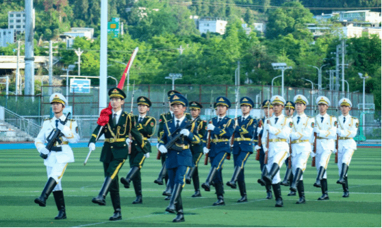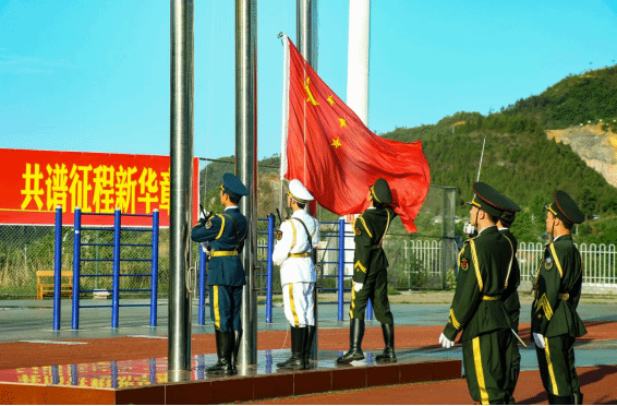 国旗护卫队迈着铿锵步伐护卫国旗入场,伴随着《义勇军进行曲》的激昂旋律,五星红旗冉冉升起,全体师生高唱国歌,向国旗行注目礼,以赤诚之心表达对祖国的热爱。