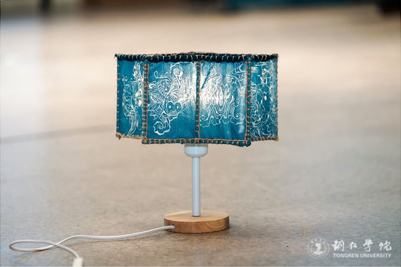 比赛现场,团队成员王佳艺身着绣有蜡染纹样的民族服饰,演示了核心作品——蜡染智能花灯:轻触开关,蓝白蜡染花瓣随机械结构舒展,苗族图腾纹样在灯光下晕染出传统与现代交织的美感,既保留了蜡染“冰纹”的独特质感,又通过“非遗+智能”的形式贴合当代审美。在6分钟路演汇报中,团队生动完美地呈现了“传统技艺+科技创新”的创新理念;2分钟答辩环节里,清晰回应了评委对市场落地性等提问,凭借鲜明的乡村文化符号与创新形态,获评委点赞“把乡土文化做成了年轻人愿意关注的潮流”。