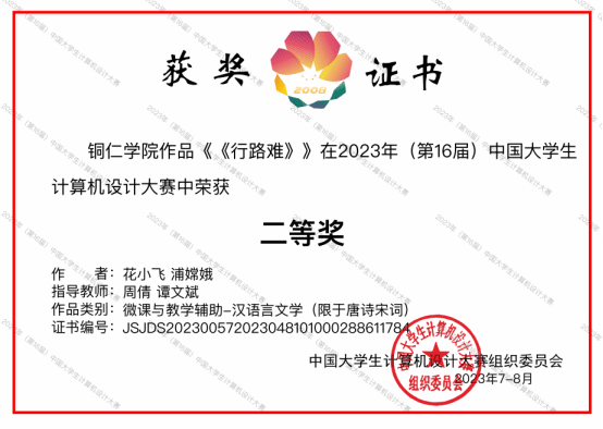 近日,(第16届)中国大学生计算机设计大赛国赛决赛正式结束。本次大赛是在院校领导的高度重视下,在教务处等职能部门的全力支持和帮助下,由谭文斌老师带队,我院学子获4项国家级奖项(国家级二等奖1项,国家级三等奖3项)。其中由周倩、谭文斌老师指导的花小飞、蒲嫦娥两名同学的作品《行路难》获微课与教学辅助组国家级二等奖;由谭文斌、易萌老师指导的旷丞吉、陆滔、吴光圣三名同学的作品《安途卫士》获人工智能应用实践组国家级三等奖;由谭文斌、钟琦老师指导的蒙勇、莫东海两名同学的作品《匠心印记 - 大学生学情动态可视化系统》获信息可视化组国家级三等奖,由邹华、饶正婵老师指导的冉光照、舒清瑜、刘亭穗三名同学的作品《生长密码 - 基于天麻生长监测与分析的可视化系统》获信息可视化组国家级三等奖。