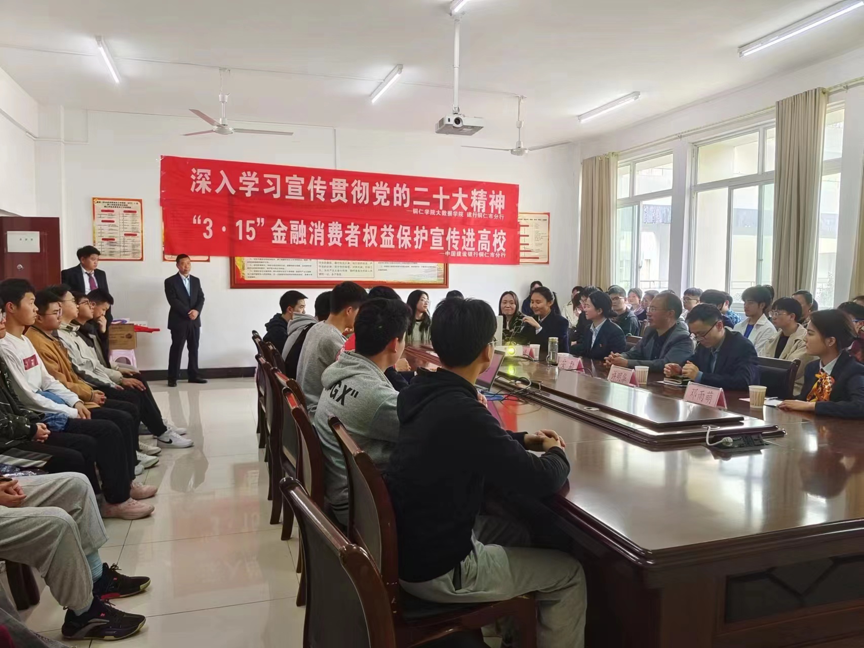 为进一步促进在校师生学习掌握金融知识,提高明辨是非的能力,帮助学生们增强防范电信诈骗的意识和能力,3月15日15:00大数据学院携手中国建设银行铜仁市分行以3.15金融消费者权益日为契机,在明理楼A二楼会议室积极开展“金融知识进校园”活动。大数据学院党委副书记安勐、中国建设银行铜仁市分行副行长许明华、渠道部副总经理邓倩、人事部经理谢亚以及银行工作人员、部分师生代表参与了活动。