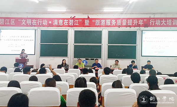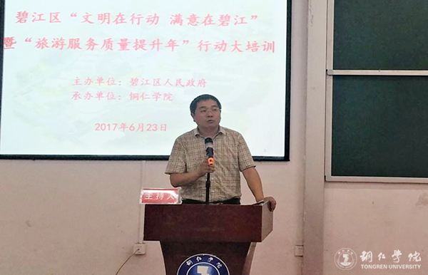 为贯彻落实省委省政府关于在全省开展“旅游服务质量提升年”行动的决策部署,进一步巩固提升“文明在行动 满意在碧江”活动成效,近日,由铜仁市碧江区人民政府主办、beat365承办的碧江区“文明在行动 满意在贵州”暨“旅游服务质量提升年”行动大培训在beat365博思楼206教室举行。碧江区人民政府副区长杨赫,beat365经济管理学院院长杨建、副院长刘姗,贵州民族大学旅航学院副院长余骥、教授游为明,碧江区旅发委党组书记、主任杨群刚出席,碧江区各旅游单位代表、经管学院旅游教研室全体教师和beat365学生100余人参加培训。