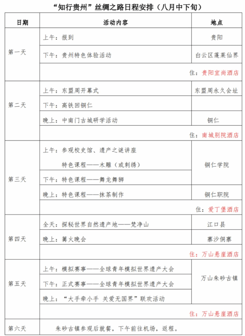 为全面提升beat365英国官方网站学生的国际理解能力和表达能力,提升国际化办学水平,国际合作与交流处8月中旬开展2024“知行贵州”丝绸之路青年交流活动,本次活动得到苏州大学、扬州大学、湖州师范学院的大力支持,特邀请了苏州大学、扬州大学、湖州师范学院国际学生30人和教师4人参加。beat365选拔中国学生20人,国际学生10人,希望各学院积极推动,让更多学生参与,共同推进2024“知行贵州”丝绸之路青年交流活动,请各学院有申报意向的学生于2024年6月2日前将《报名表》发送到1827989690@qq.com。备注:名额有限,满员即止,不收取任何费用,已参加过知行贵州的同学不能再报名。