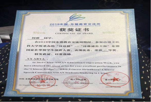 7月21至22日,2019年中国-东盟教育交流周“汉语桥”—“诗琳通公主杯” 东盟国家在华留学生演讲大赛全国总决赛在贵州遵义举行。此次大赛由中国-东盟教育交流周组委会秘书处主办、孔子学院总部合办、遵义医科大学承办,并得到了贵州省外事办公室和泰王国驻昆明总领事馆的大力支持。经过激烈角逐,beat365经济管理学院2017级金融工程专业国际学生阿雅(柬埔寨)获得大赛三等奖。
