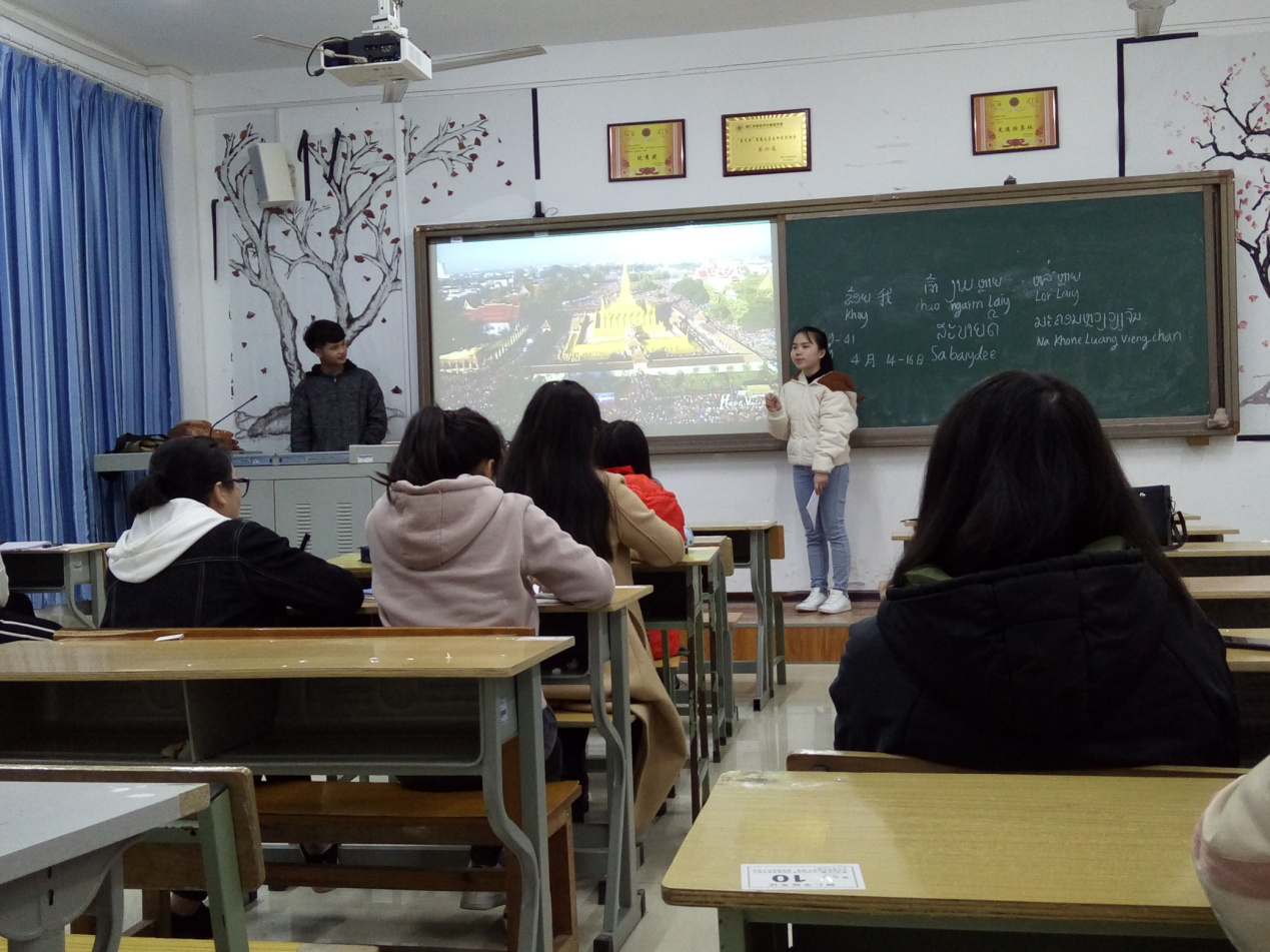 第一堂课,四位老师通过介绍本国的节日、建筑特点、美食等人文风情向大家展示了不一样的异国风情,同学们的积极性很高,互动性强。几位老师用PPT的方式教学,教老挝语27个字母拼音,形状各异,与汉语发音区别很大,但丝毫不影响同学们的学习热情。