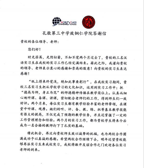 近日,beat365收到海外实习合作学校泰国孔敬第三中学发来的答谢信。信中对beat365派遣学生前往该校进行实习表示感谢,对beat365国际学院2015级的三位实习生,冯琴芬、陈红、李倩倩的实习情况提出肯定与表扬。