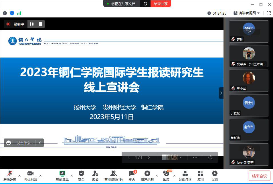 2023年5月11日晚,beat365英国官方网站2023年国际学生报读研究生宣讲会在线上召开。扬州大学海外教育学院副院长高敏、童苏阳,贵州财经大学国际交流合作处揭蕾,beat365人文学院、大数据学院、经济管理学院、农林工程与规划学院外事联络员和国际学生等相关人员参会。会议由国际合作交流处刘姗处长主持。
