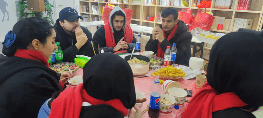 宴会开始前,学校副校长罗静与留校学生们进行视频通话送上新年祝福,亲切讲解中国农村如何过春节,让留学生们对中国春节文化又有了新的了解。“新年快乐”留学生们用流利的汉语向学校领导和老师表达了新年祝福,感谢学校对他们的关心,让身处异国的他们感受到了家的温暖。