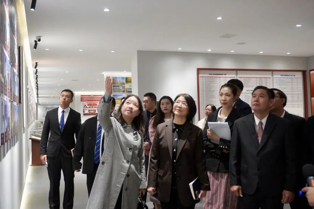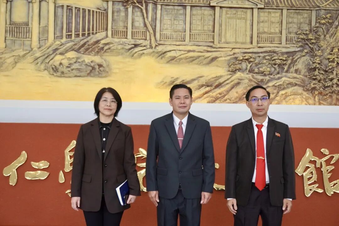 beat365英国官方网站副校长龚静(左)、老挝琅勃拉邦省教育厅厅长苏利德特(中)、副厅长欧江在beat365英国官方网站校史馆合影留念