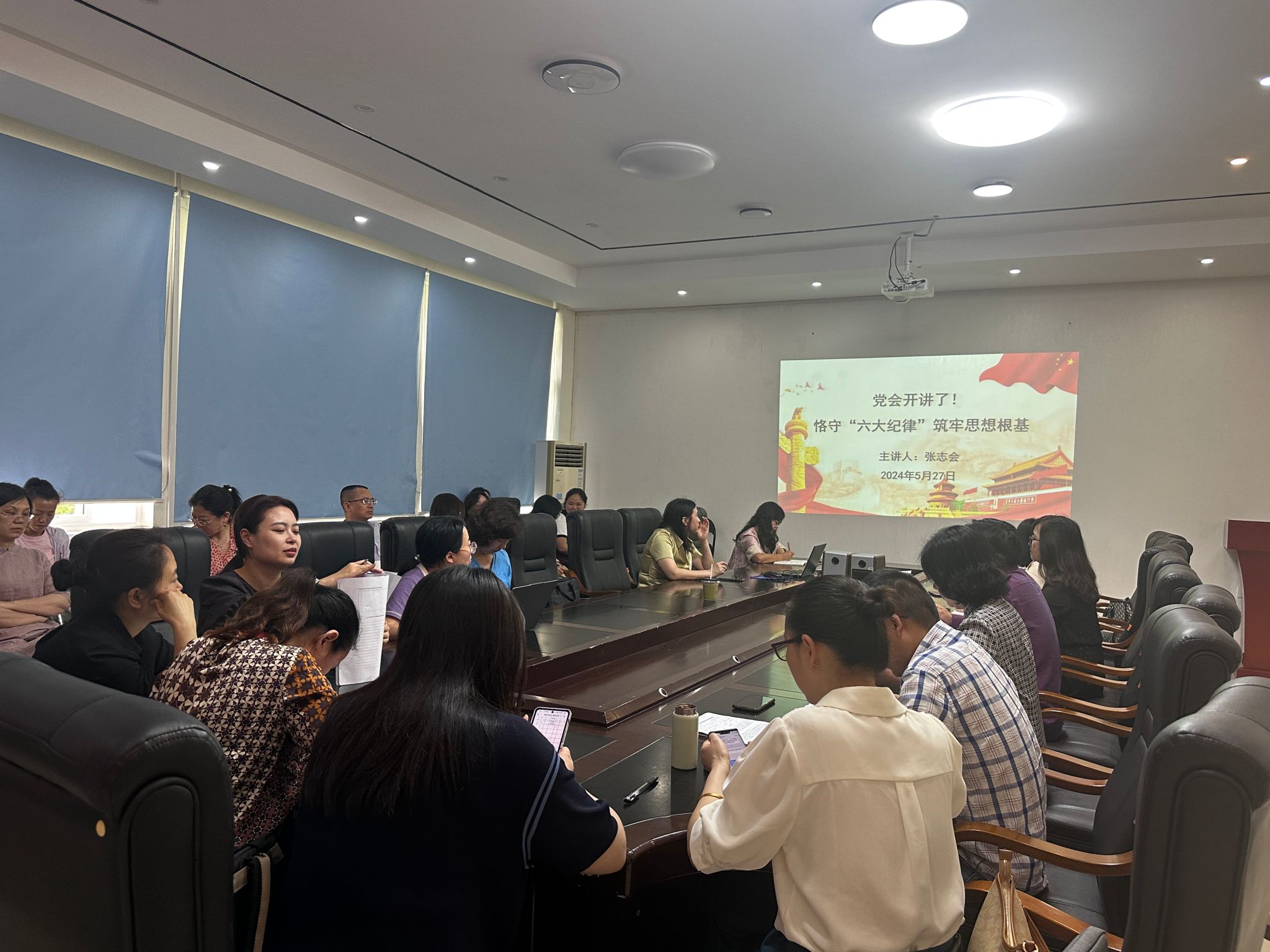 5月27日下午,院党委书记张志会在明理楼A三楼会议室为教工党支部全体党员上党纪学习教育纪律党课。