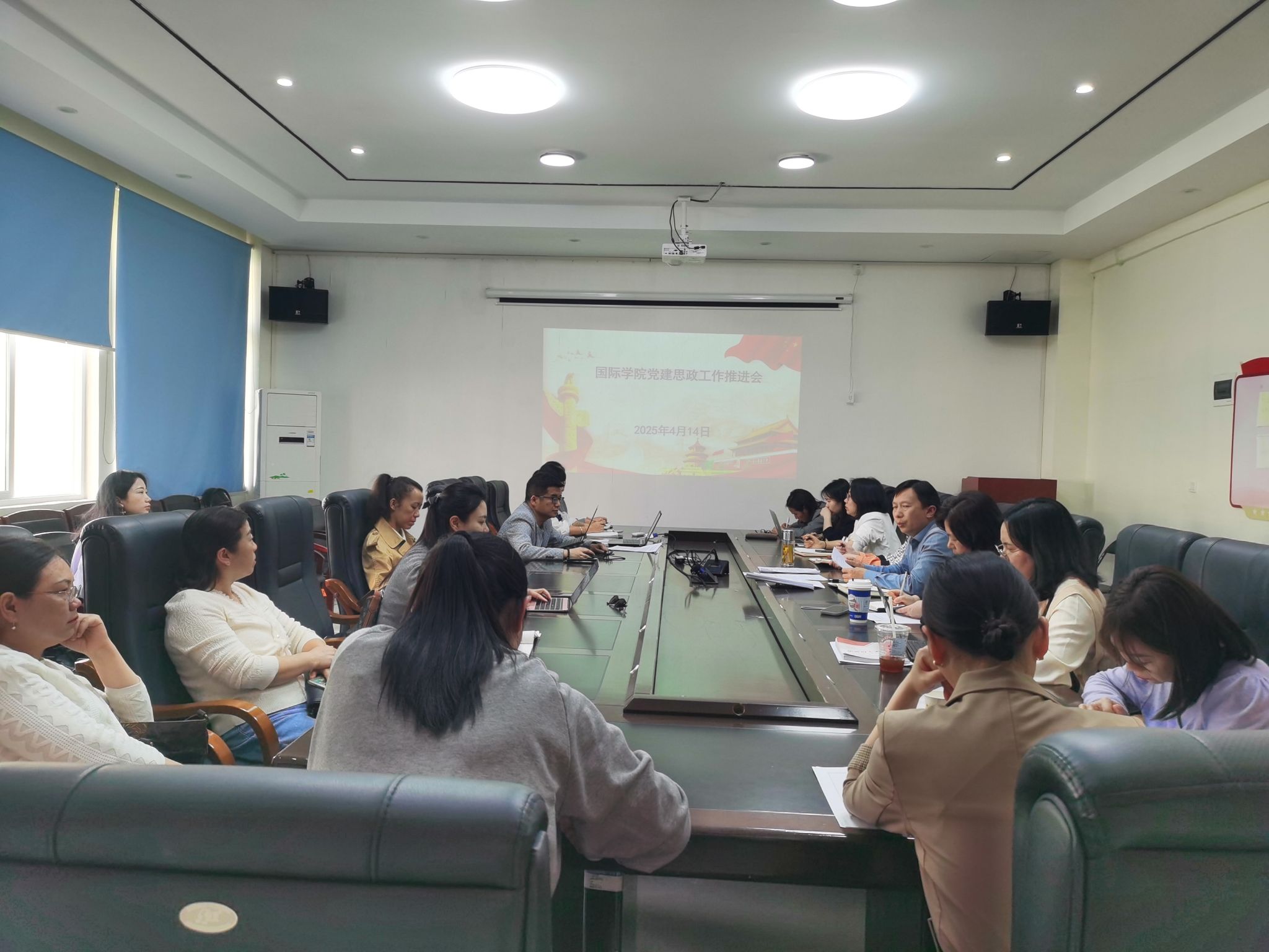 4月14日下午,国际学院在三楼会议室召开党建思政工作推进会,院党政领导班子成员、各系部(科室)负责人和全体党员同志参加会议。