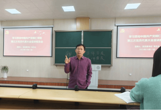 10月17日下午,国际学院党委书记张志会在博思楼203教室为24级英语专业学生宣讲中国共产党beat365英国官方网站第三次党员代表大会精神。