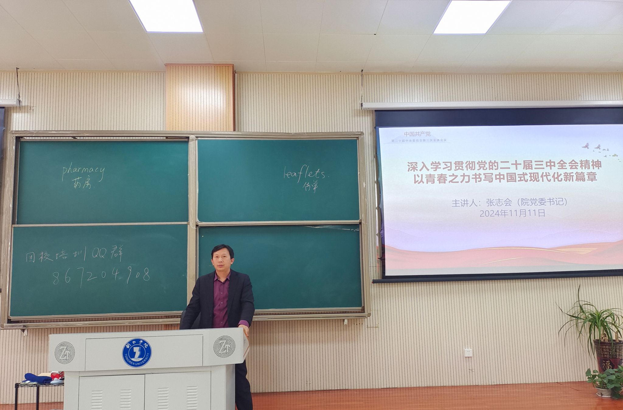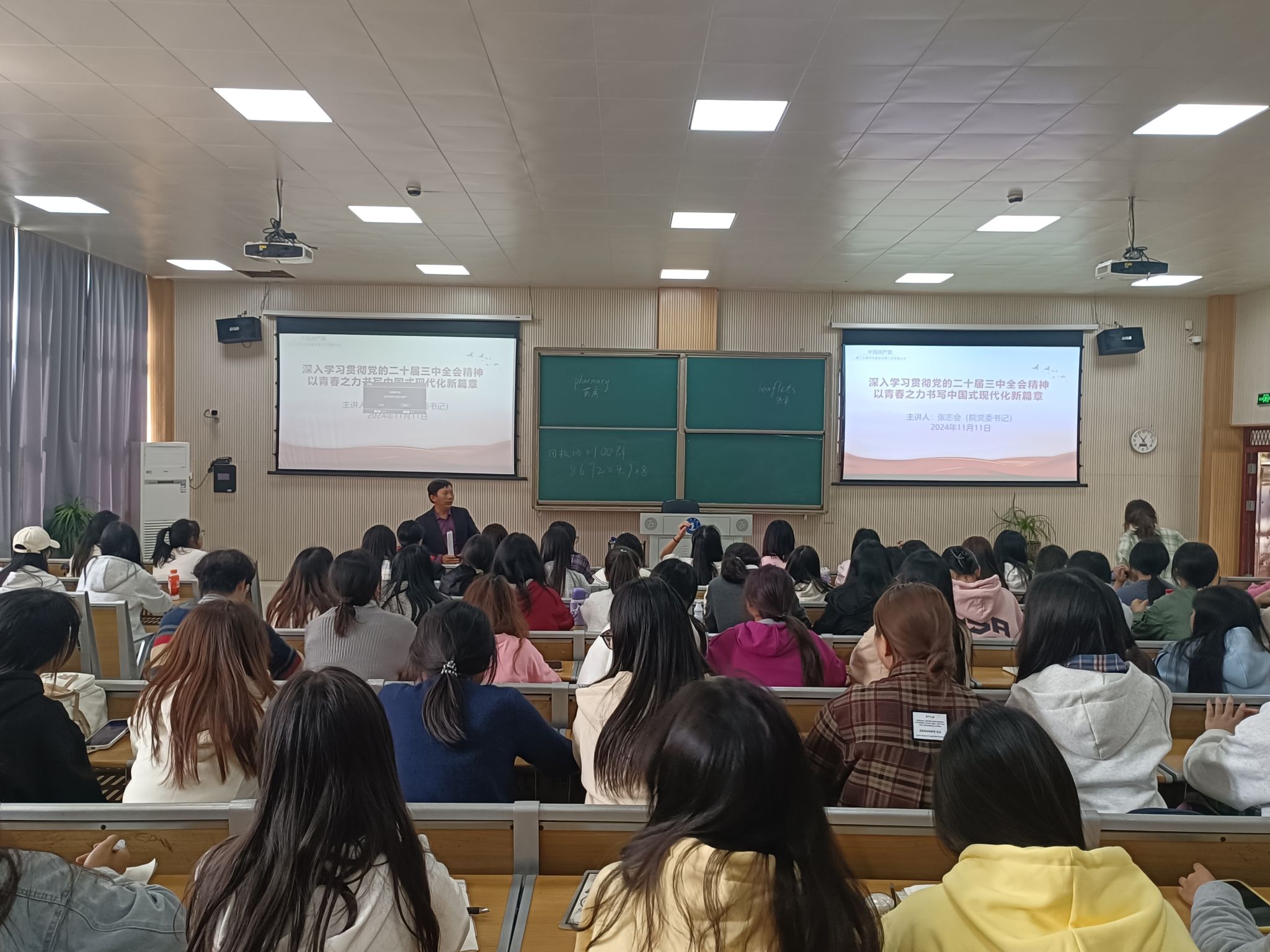 11月11日中午,院党委书记张志会在博思楼102教室为国际学院2024年“青马班”讲授思政课。