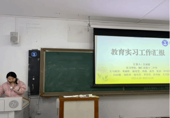 最后,杨芹副院长对此次大会进行总结发言。一开始便衷心地感谢带队老师高琼芳在学生实习期间的付出,同时也恭喜各位同学实习工作得以圆满完成。其次表达自己对此次汇报的一些感触,针对此次汇报存在的问题进行一一讲解。她希望各位不要被惯性思维所困住,要对自己的每一份工作有所感悟及反思,大胆表达自己,对教育实习必须要有正确的认识。杨芹副院长强调了“一践行三学会”:践行师德、学会教学、学会育人、学会发展。这是师范专业技能考核的相关要求,也是每位师范生应具备的能力。望各位予以高度重视,在未来的教师工作中落到实处。同时要求大家下学期按时返校完成研习任务,积极与指导教师沟通写好毕业论文,能够积极主动地复习,准备考工作,认清当前就业形势,做好职业规划。