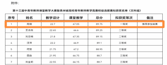 刘玮老师获得第五届全国高校混合式教学设计创新大赛优胜奖;周倩老师获得第十三届中青年教师课堂教学大赛暨贵州省高校青年教师教学竞赛校赛一等奖,获推荐省赛。