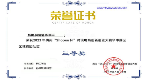 周倩、饶华宏老师分别指导学生,获得第十八届挑战杯全国大学生课外学术科技作品竞赛贵州省一、二等奖。孙用常、饶华宏、高琼芳、杨潇老师指导学生,获得Shopee杯跨境电商创新创业大赛三等奖两项、优秀奖两项。