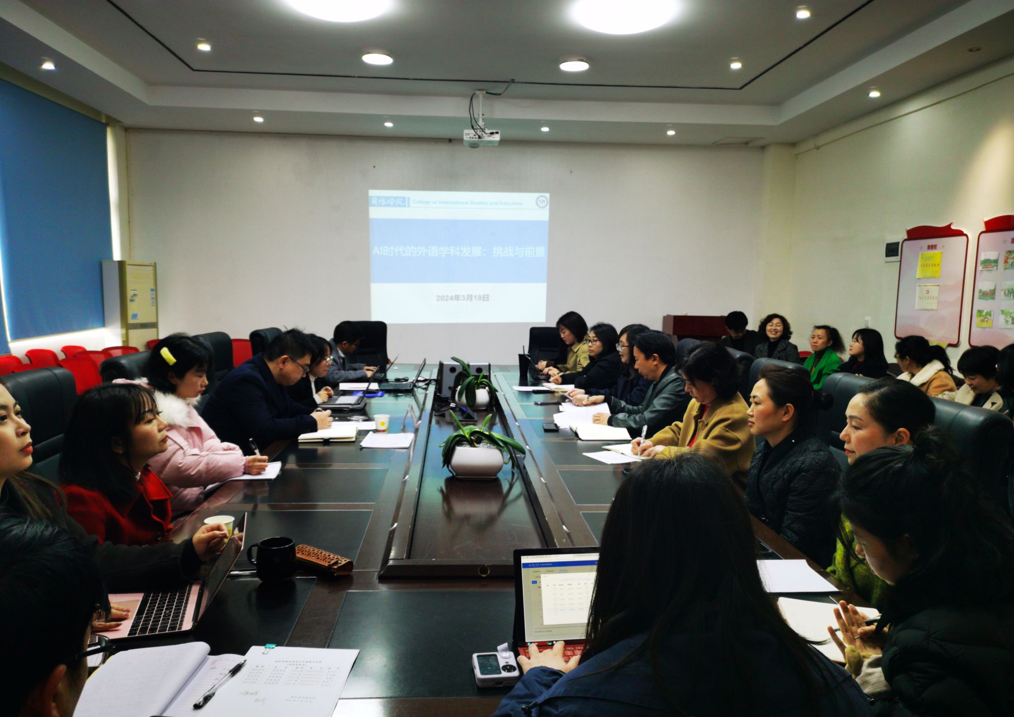 本次会议紧紧围绕“AI时代的外语学科发展:挑战与前景”开展研讨。科研科科长饶华宏以“人工智能在外语学科学术研究中的机遇与挑战”为题作了主题发言。在研讨发言中,副院长李谦教授以外语学科发展的视角,分析了人工智能时代科学研究的挑战与前景。党委副书记鲁芮汐教授在发言交流认为,AI技术的发展改变了外语学科人才培养的目标和流程,提出了“语言+人工智能”的研究方向。石慧敏教授从外语教育教学的角度,提出外语教师要探究新科技赋能下的课程改革新路径,以科研成果为基础反哺教学。商务英语专业负责人杨婷副教授认为,AI技术助力了老师们的科研和教研工作,教师们应该思考在教学中拥抱AI技术,积极探索新的人才培养模式。党政办主任皮谨煜副教授从AI对教师角色、教学模式、教学方式等的影响,提出了AI与外语教学的深度融合,促进学习者深度学习和思考。青年教师代表周倩结合自身经验,认为作为教育工作者要主动拥抱这一技术,善用其优势支撑教书育人及科学研究工作;汪萍博士从AI技术对外语学科人才培养带来的改变角度出发,探讨了外语学科的知识生产功能,分析了外语学科的创新发展路径,提出外语教师更应重视用AI赋能教育;罗芳斐博士从AI时代韩国高校外语学科建设情况出发,对比国内高校发展,发现在语种多样性、本硕博人才培养机制、跨学科发展等三个方面提出了外语学科建设的意见和建议。在自由讨论中,副院长杨芹副教授及孙用常、胡红渊等教师也纷纷围绕人工智能对外语教育数字化转型发展、外语专业人才数字意识培育、外语教师数字能力提升等语言学科专业创新发展问题进行交流探讨。与会教师纷纷认为,外语教育教学须迎接并主动拥抱语言智能发展带来的巨变。语言学与数字研究、AI技术对接都将是未来外语学科研究的新趋势,教师们应尽快适应智能化教育创新发展趋势。