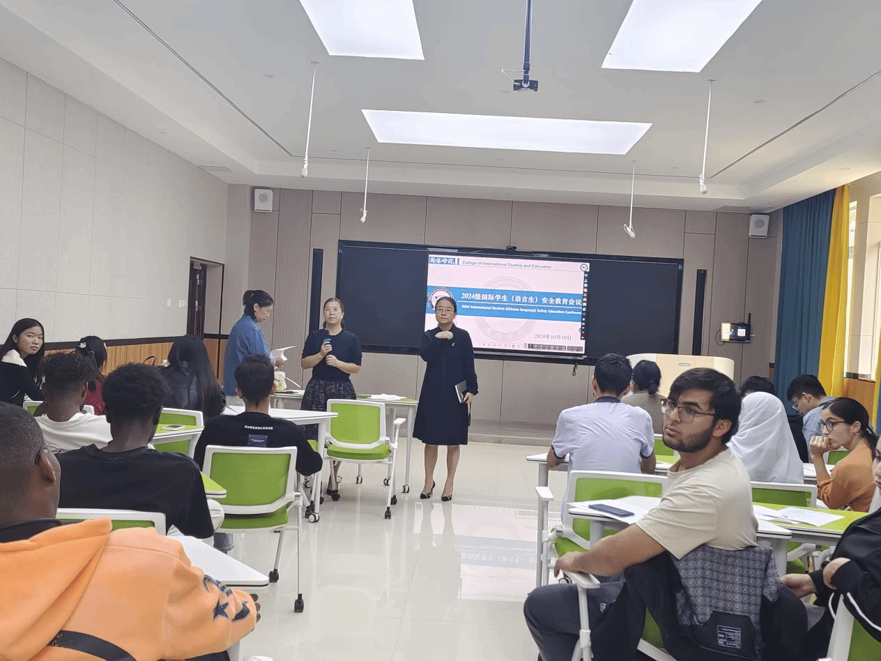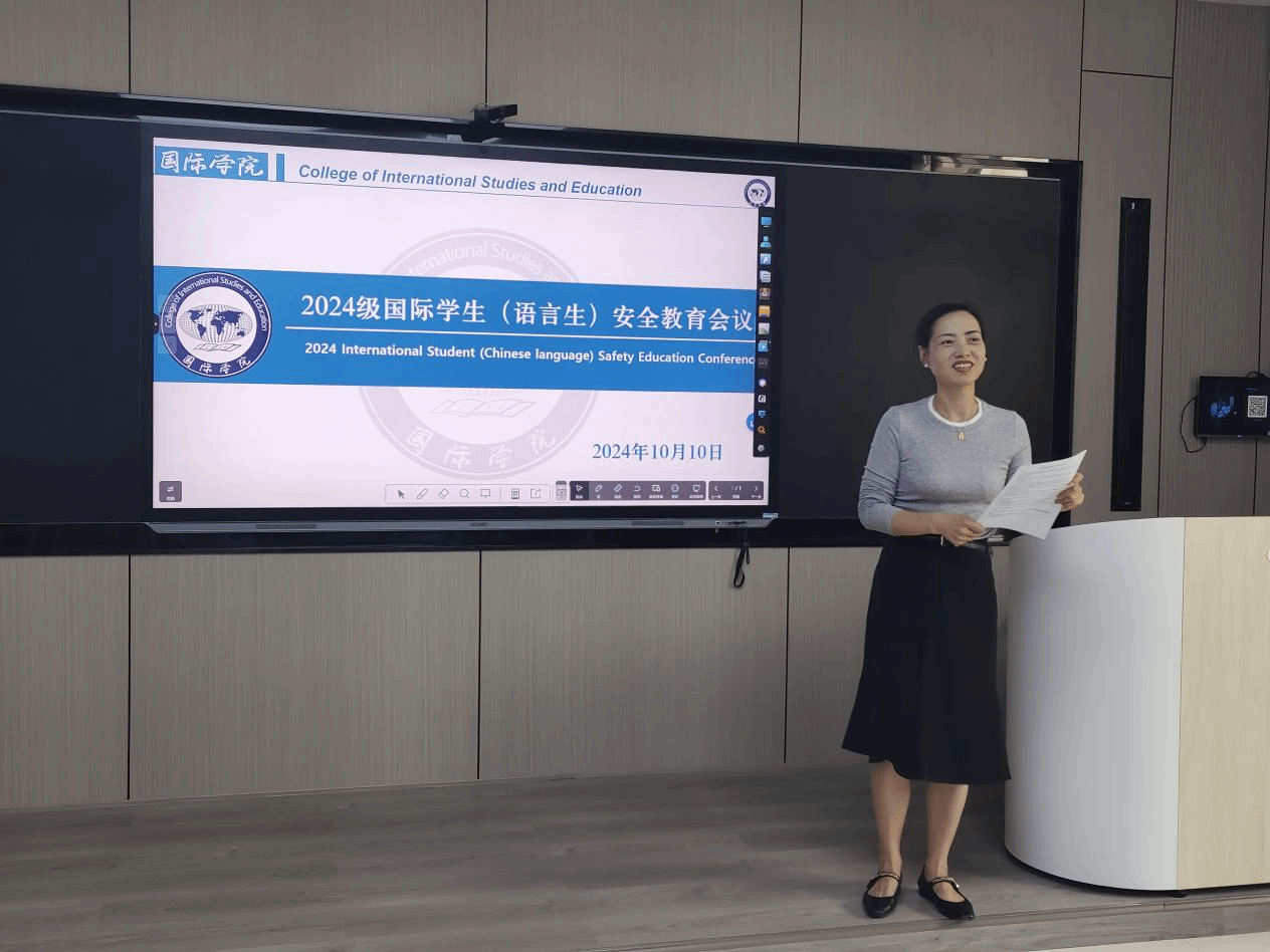 为有效防范校园安全事故的发生,保障新学期教育教学工作的顺利进行,2024年10月10日下午,国际学院在明理楼A301智慧教室举办了国际学生安全教育会议。会议邀请校保卫处副处长杨兴国作安全专题讲座,2024级全体国际学生(语言生)参加会议。会议由国际教育系负责人何沐老师主持。