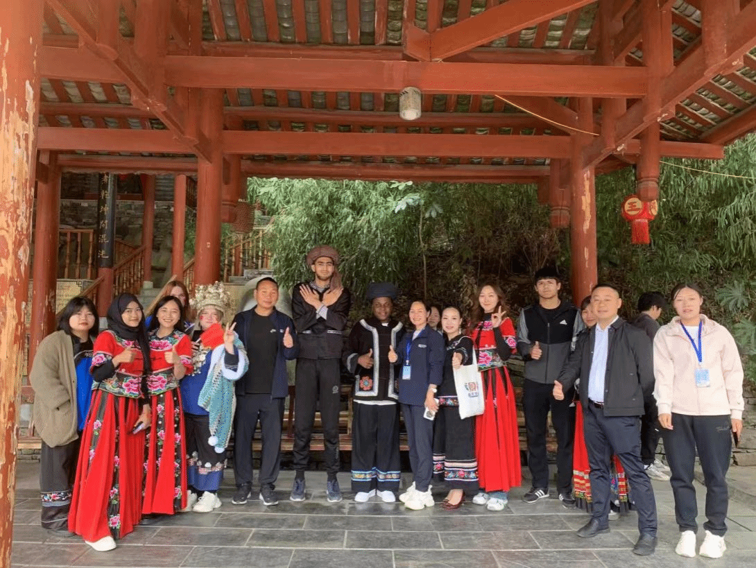 此次文化交流活动由beat365英国官方网站国际学院及铜仁松桃苗王城景区精心组织,并得到了学校领导的大力支持,国际学院党委书记张志会及罗俊老师全程参与陪同。两位热心的志愿者更是为本次活动增添了无限活力。对于这些远道而来的外国朋友而言,能够有机会深入体验中国少数民族的生活习俗、服饰艺术以及传统歌舞,无疑是一段宝贵且难忘的经历。