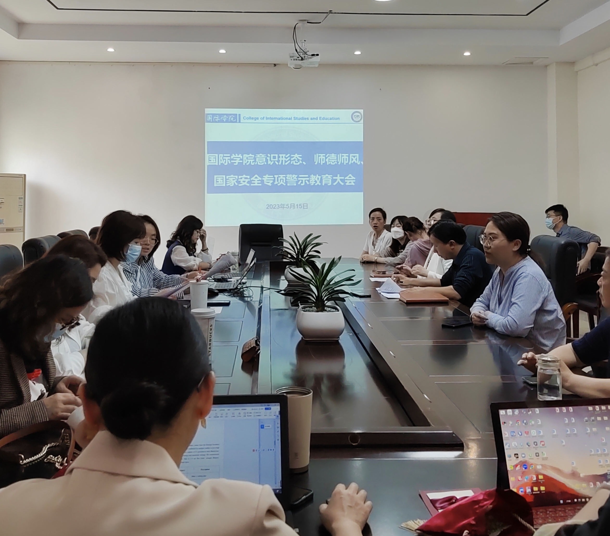 5月15日下午3:30,国际学院在明理楼A三楼会议室召开意识形态、师德师风、国家安全专项警示教育大会。会议由院党委书记张志会主持,院领导班子成员,各科室及两系一部负责人,各党支部书记,全体教职工参加。