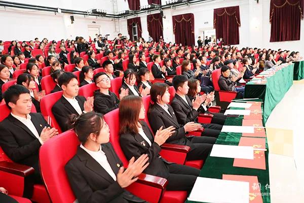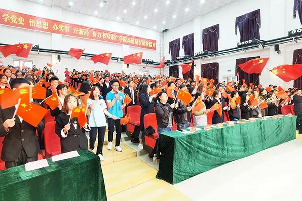 大会最后,全体人员齐声高唱《没有共产党就没有新中国》,挥舞着手中的红旗,抒发内心的爱党爱国爱校之情,将荣誉转化为前行的强大动力,感恩奋进。
